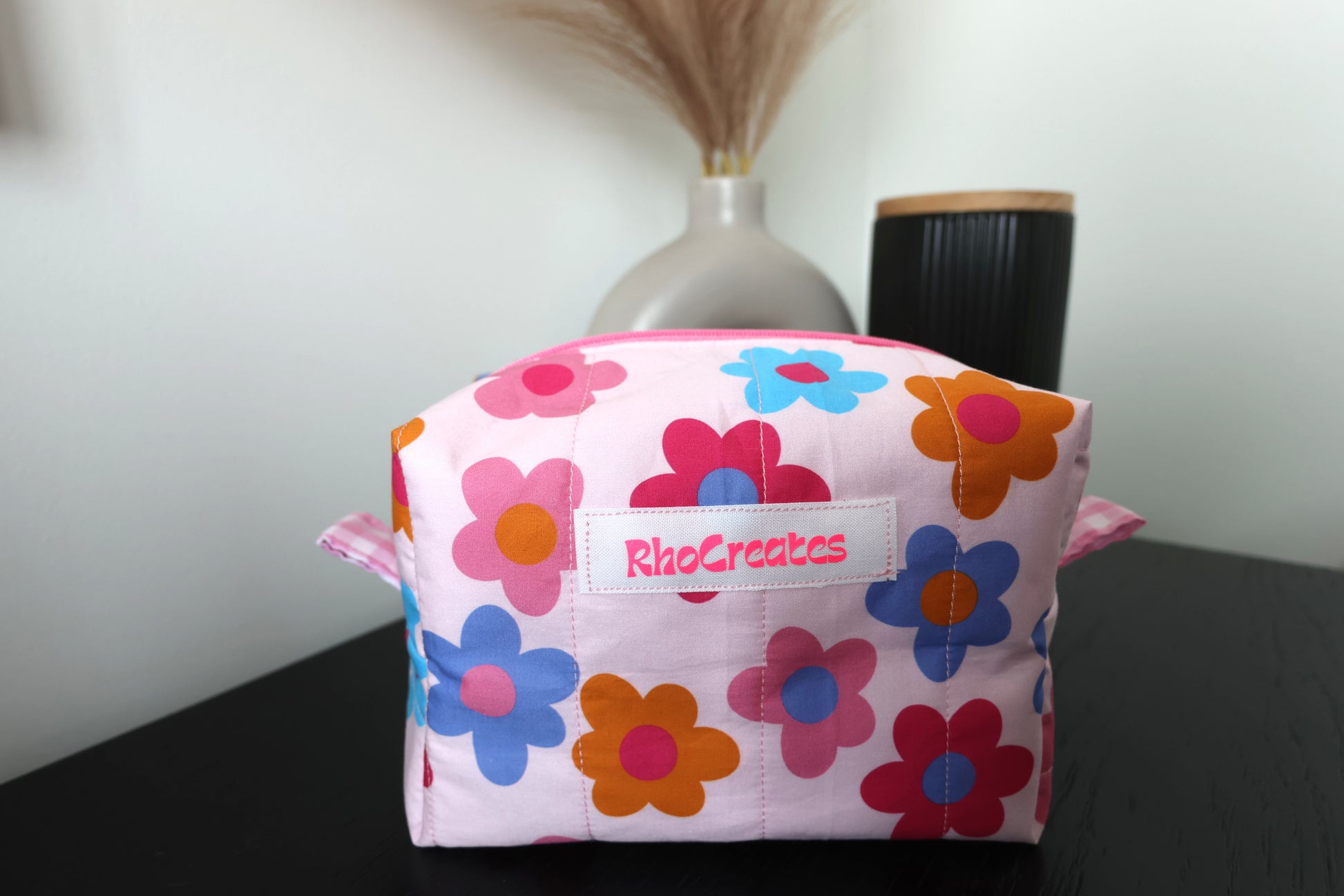 Bright, cheerful, and handcrafted with love. This quilted makeup bag features a beautiful mix of cosmos flowers in varying shades, creating a fresh and vibrant floral look.